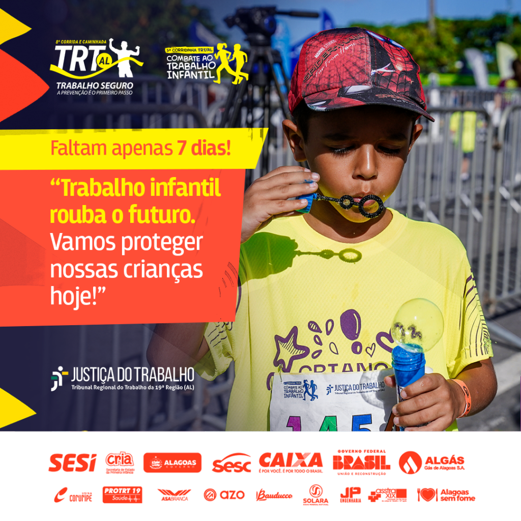 A contagem regressiva continua! Estamos a apenas 7 dias de um dos eventos mais importantes do ano: a 8ª Corrida TRT/AL. Além de promover saúde e bem-estar, essa corrida carrega uma mensagem poderosa contra o trabalho infantil.