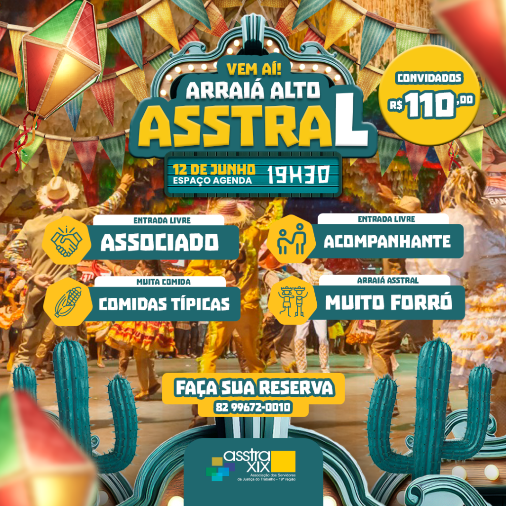 A Associação dos Servidores da Justiça do Trabalho da 19ª Região (ASSTRA XIX) tem o prazer de convidar todos os seus associados para uma noite inesquecível de celebração junina! 🎶