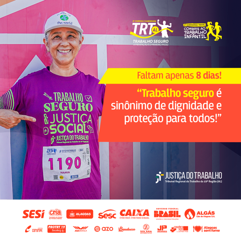 A contagem regressiva está quase no fim! Faltam apenas 8 dias para a 8ª Corrida TRT/AL e a Corridinha. Este evento é muito mais do que uma celebração esportiva; é um marco na luta por causas essenciais como a promoção do trabalho seguro e o combate ao trabalho infantil.